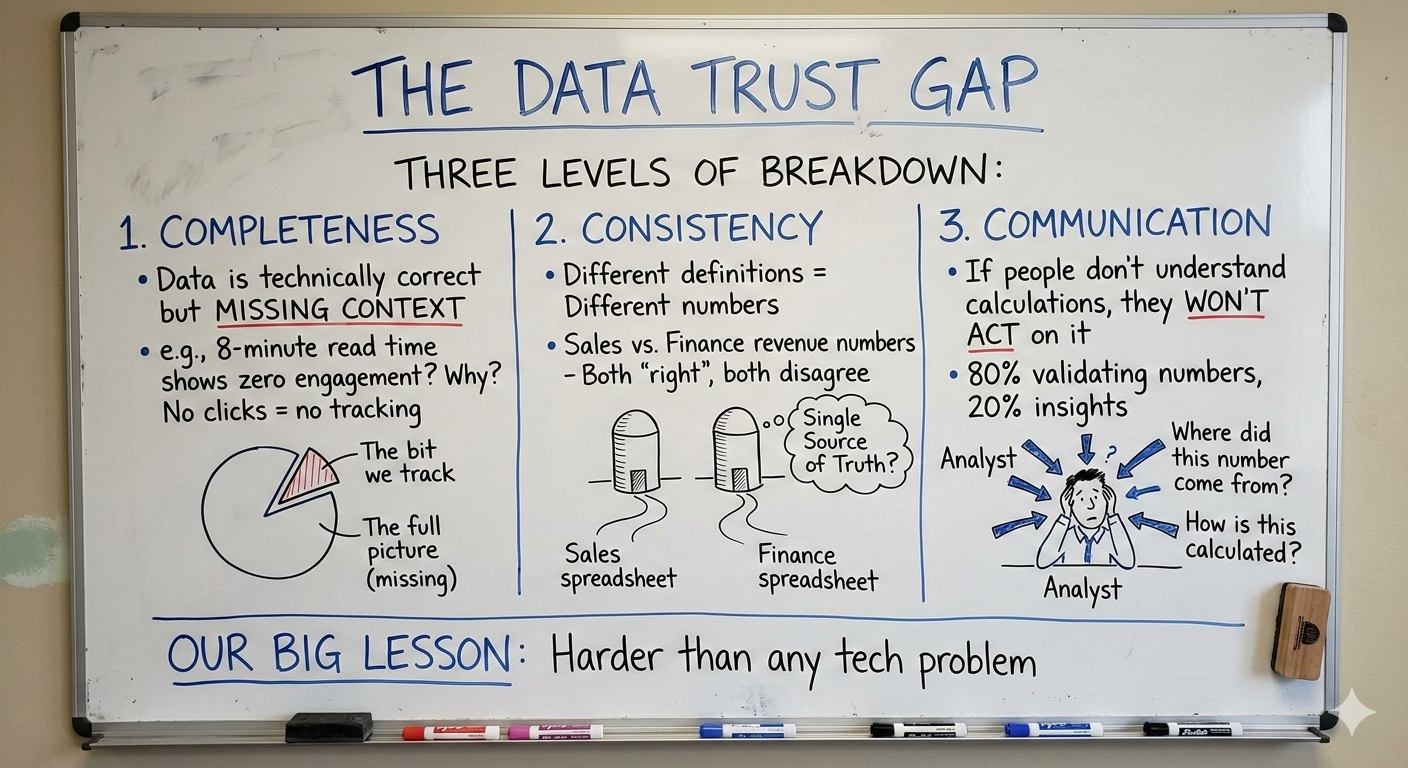 Completeness — The data is technically correct, but it's missing context. A reader spends 8 minutes on your best article and your analytics show zero engagement. Why? Because they arrived, read, and left without clicking anything. The data isn't wrong — it's just incomplete. And incomplete data destroys confidence faster than wrong data.